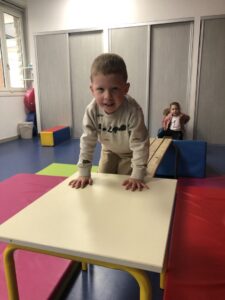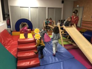 A chaque période, une matinée « 100% Sport » nous sera proposée. La première s’est déroulée vendredi 17 octobre. Nous avons participé à trois ateliers différents : parcours avec des engins roulants, dans la cour de récréation, parcours « Quadupédie », dans la salle de motricité, séance de yoga, dans le dortoir.